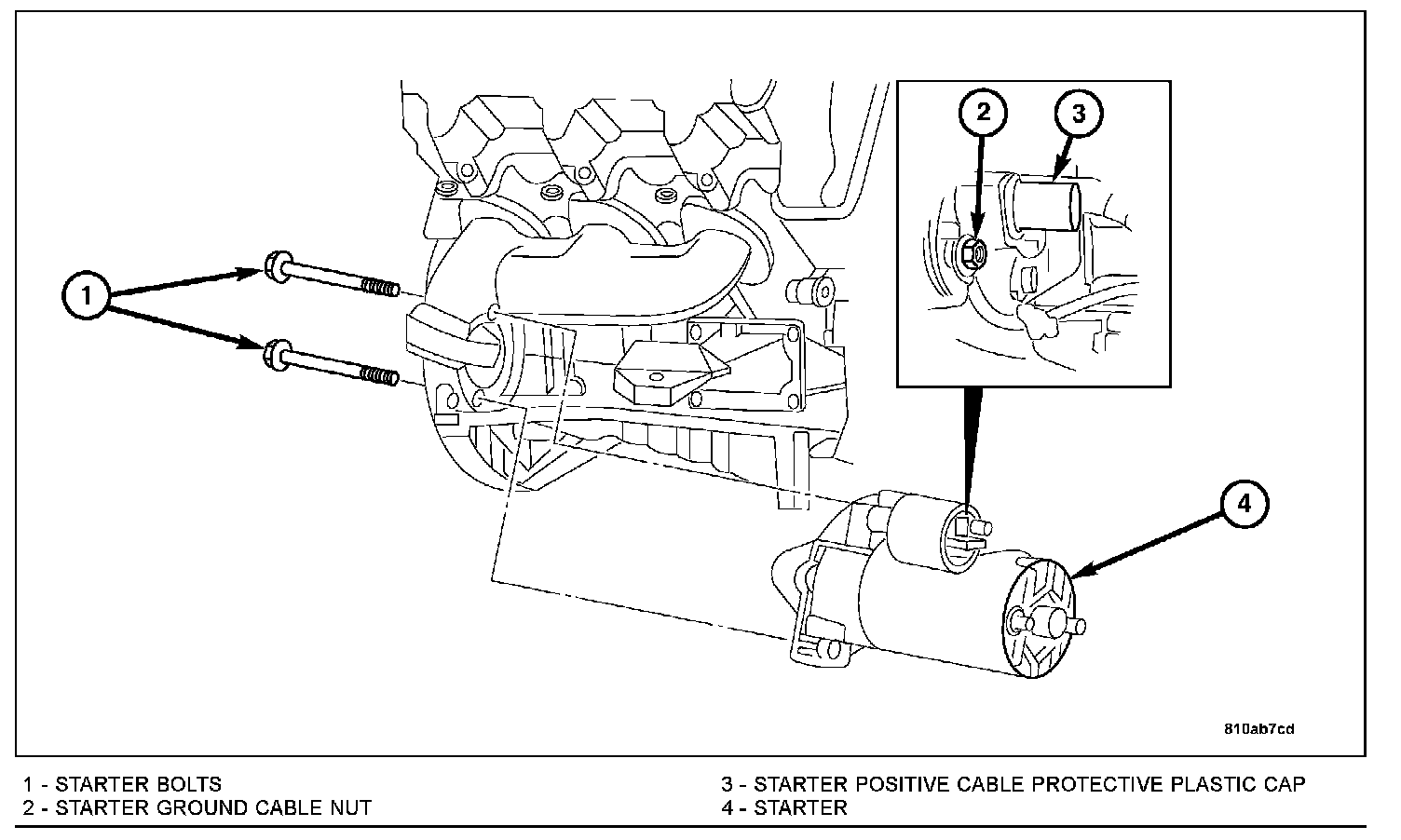 7. Remove the starter positive cable protective plastic cap (3).