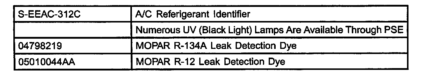 ^ Daimler/Chrysler recommends the detection of A/C system leaks through the use of approved leak detectors available through Pentastar Service Equipment (PSE) and fluorescent leak detection dyes available through MOPAR Parts.