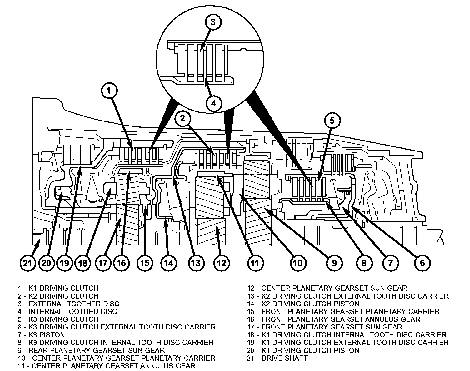 Three multi-plate driving clutches the front, middle and rear multi-plate clutches K1 (1), K2 (2) and K3 (5), are located in the planetary gear sets in the transmission housing.