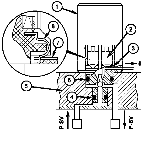 If a solenoid valve is actuated by the TCM, it opens and guides the control pressure (p-SV) to the assigned command valve. The solenoid valve remains actuated and therefore open until the shifting process is complete. The shift pressure (p-SV) to the command valve is reduced to zero as soon as the power supply to the solenoid valve is interrupted.