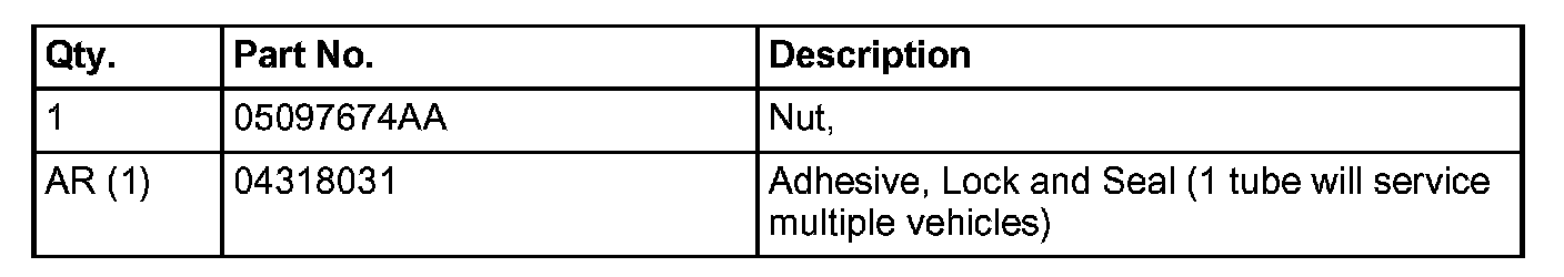 If p/n 05097674AA nut is not available, the technician may remove the old nut and apply pin 04318031 Mopar Lock & Seal Adhesive to the threads of the nut and install.