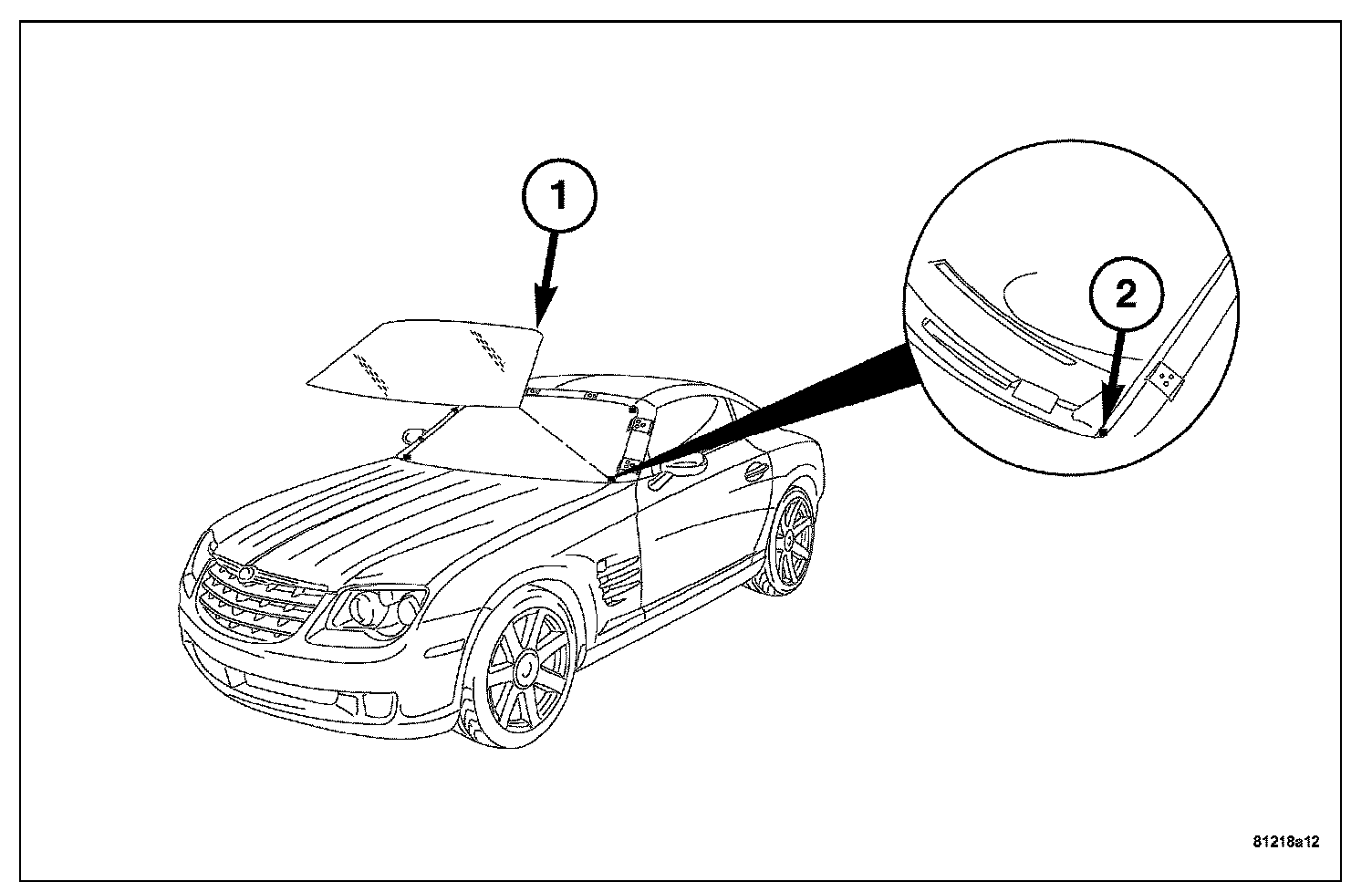 14. Install windshield side moldings (1) and top molding (2).