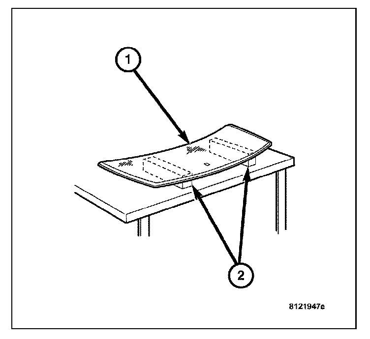 5. Position the windshield (1) inside up on a suitable work surface with two padded, wood 10 cm by 10 cm by 50 cm (4 in. by 4 in. by 20 in.) blocks (2), placed parallel 75 cm (2.5 ft.) apart.