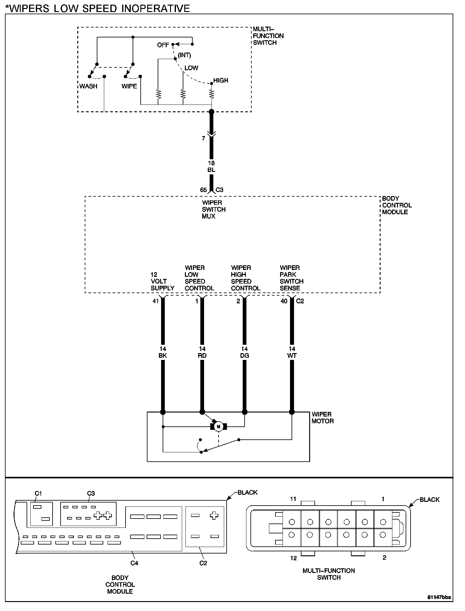Backprobe the BCM C3 harness connector cavity 65 for voltage with the Wiper Switch in the Low position.