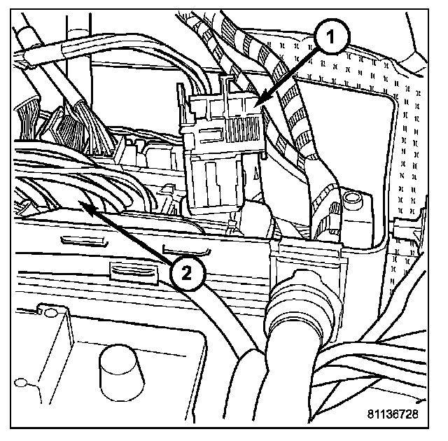 2. Connect the wiper motor harness connector (1) to the Body Control Module (BCM) (2).