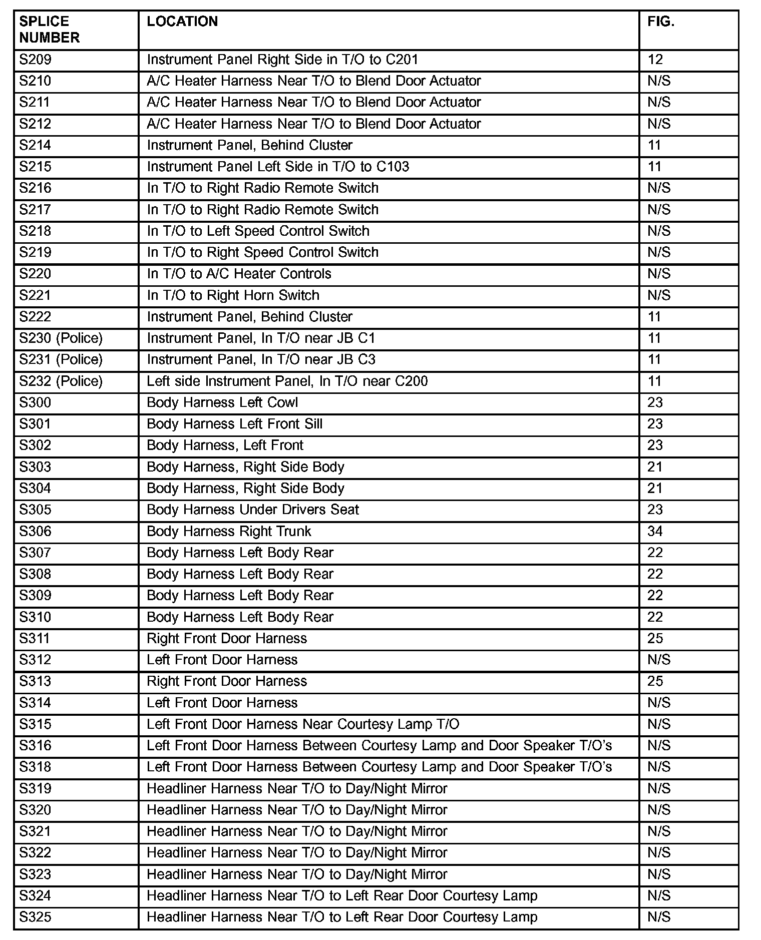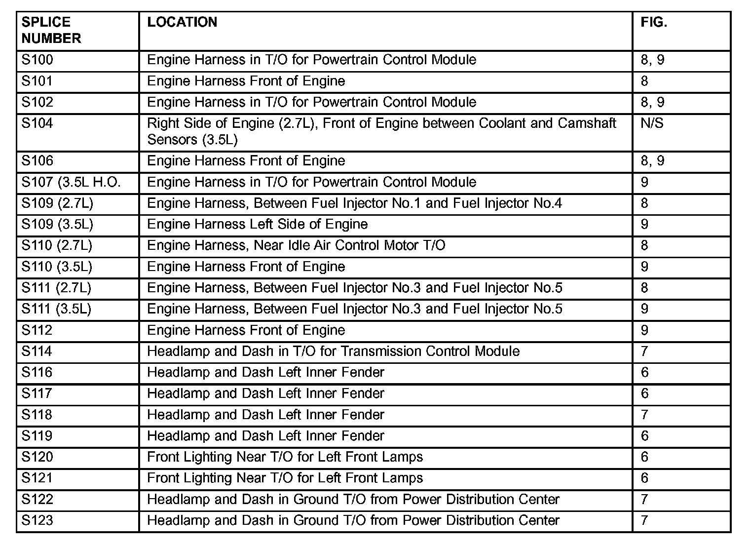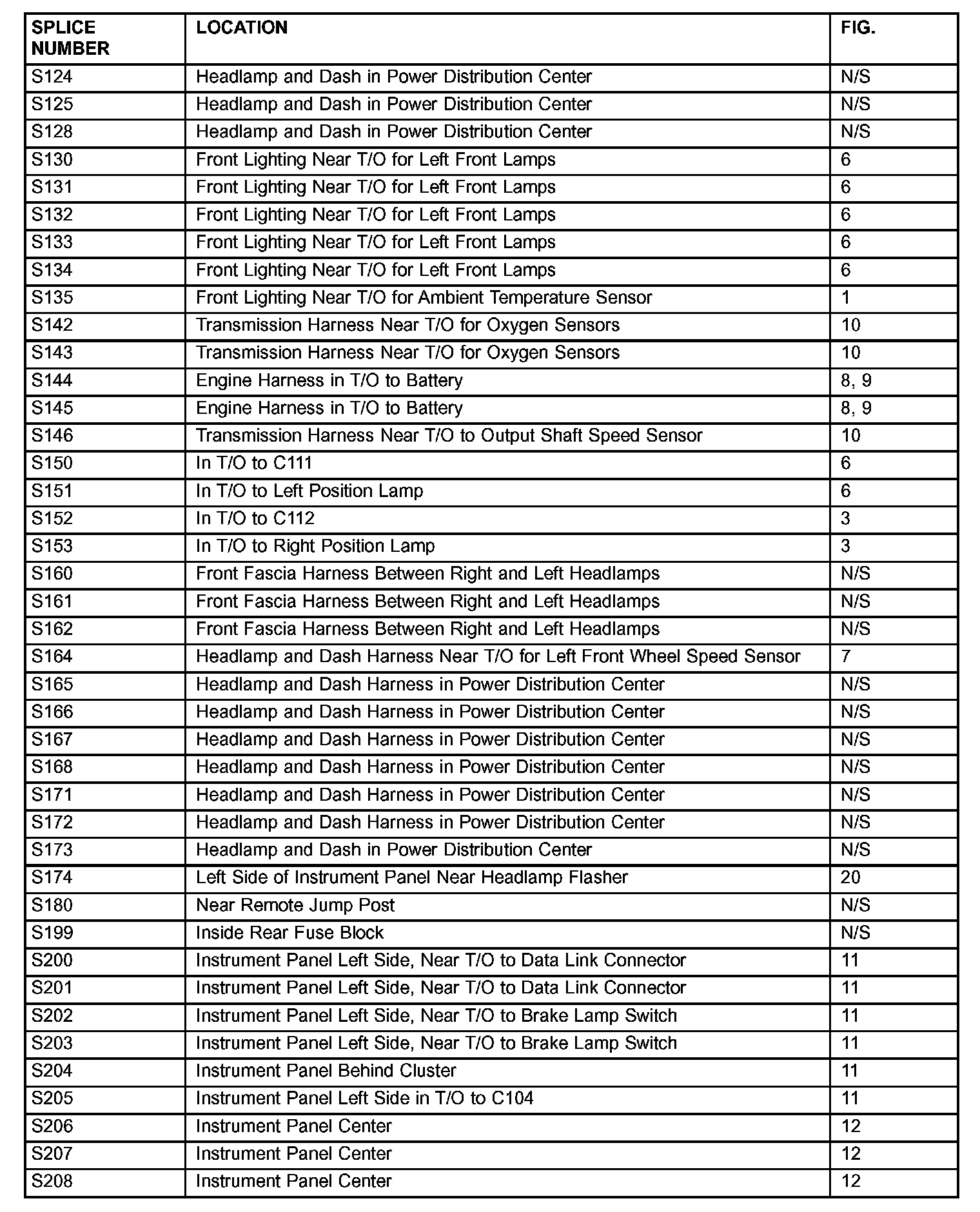 The abbreviation T/O (Take Out) is used in the location column to indicate a point in which the wiring harness branches out to a component.