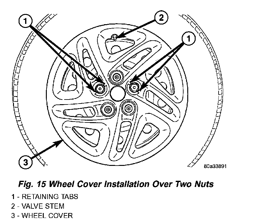 c. Press in on center of wheel cover until wheel cover retaining tabs push past and engage rear of previously installed wheel mounting nuts. This will hold the wheel cover in place.