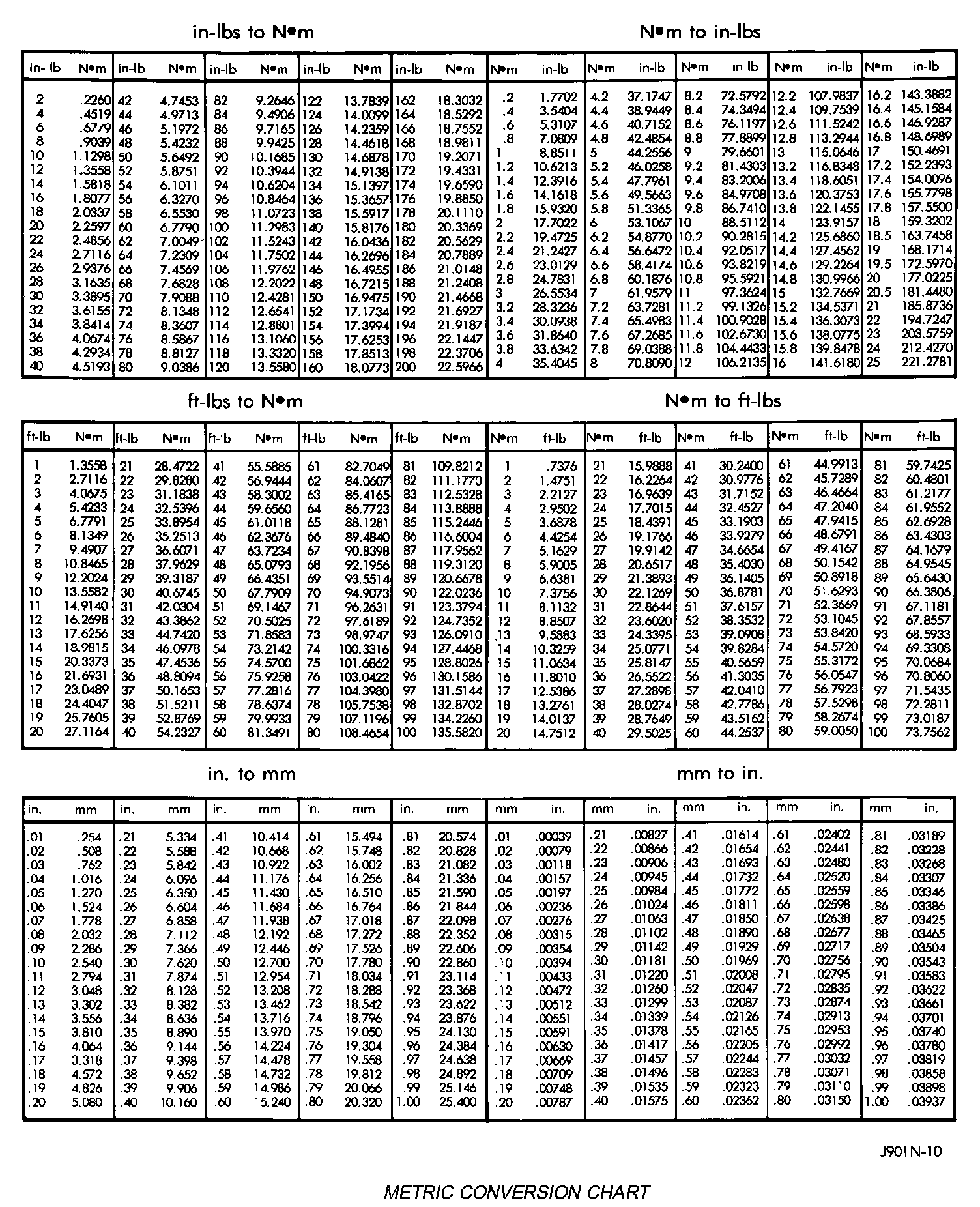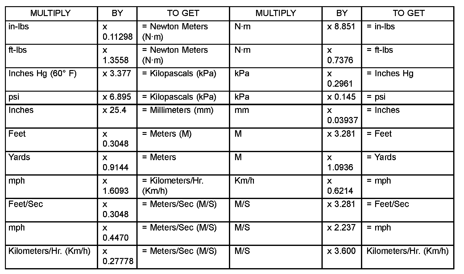 Refer to the Metric Conversion Chart to convert torque values listed in metric Newton-meters (Nm). Also, use the chart to convert between millimeters (mm) and inches (in.).