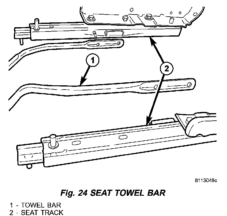 1. From the underside of the seat, squeeze ends of towel bar inward to release from pivot studs (Fig. 24).