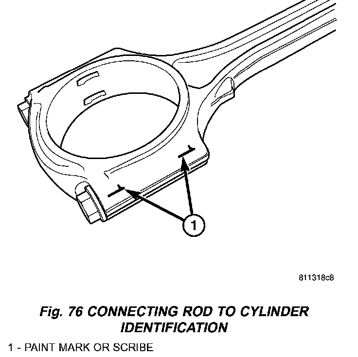 10. Remove connecting rod bearing caps. Connecting rod bearing caps are not interchangeable and should be paint marked or scribed before removal to insure correct assembly (Fig. 76) (Fig. 78).