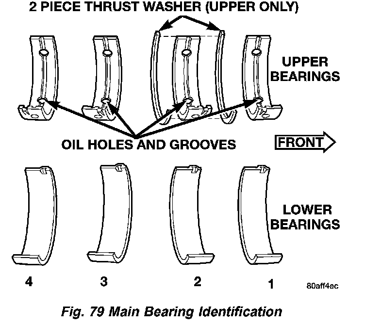 1. Install crankshaft upper main bearings in cylinder block. Ensure oil holes in bearings line up with oil holes in cylinder block (Fig. 79).