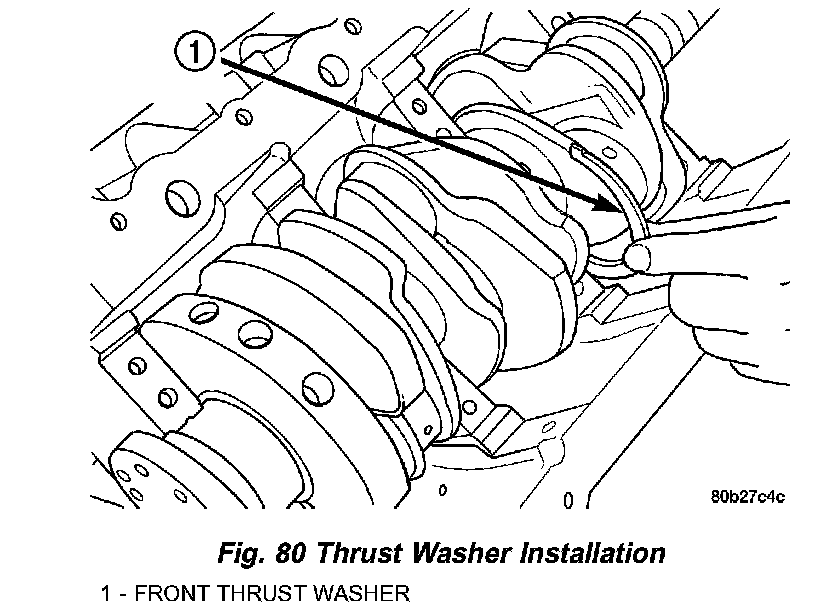 3. Move crankshaft forward to limit of travel. Lubricate and install the front thrust washer by rolling the washer onto the machined shelf between the No. 2 upper main bulk head and crankshaft thrust surface (Fig. 80).