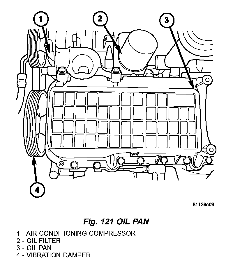 13. Remove oil pan fasteners. Remove oil pan (Fig. 121).