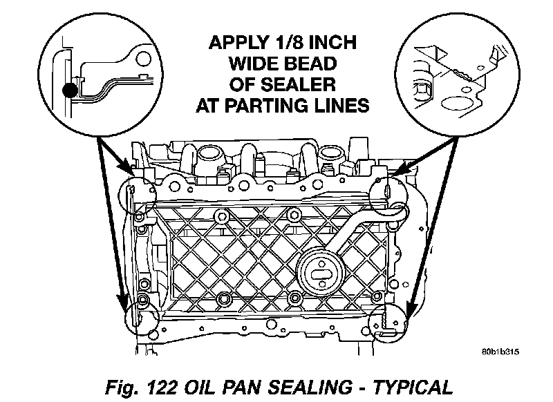 2. Apply a 1/8 inch bead of Mopar Engine RTV GEN II at the parting line of the oil pump housing and the rear seal retainer (Fig. 122).