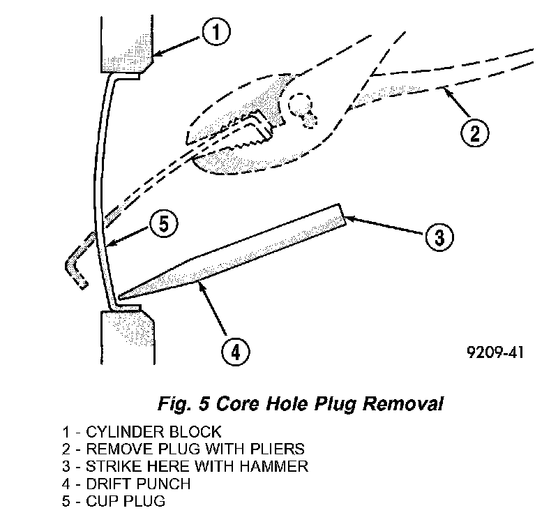 STANDARD PROCEDURE - ENGINE CORE AND OIL GALLERY PLUGSUsing a blunt tool such as a drift and a hammer, strike the bottom edge of the cup plug. With the cup plug rotated, grasp firmly with pliers or other suitable tool and remove plug (Fig. 5).