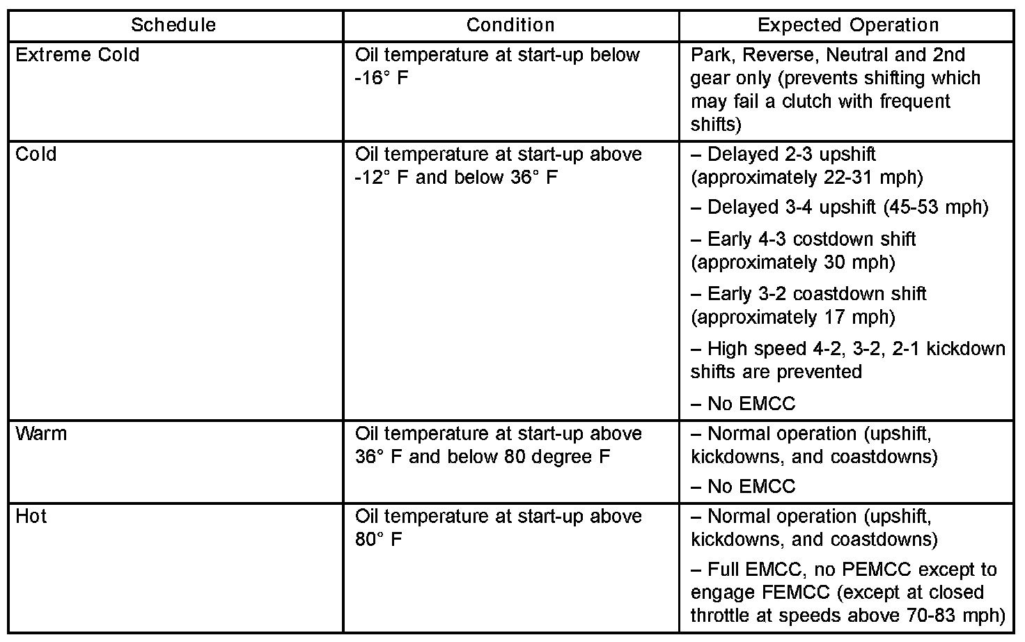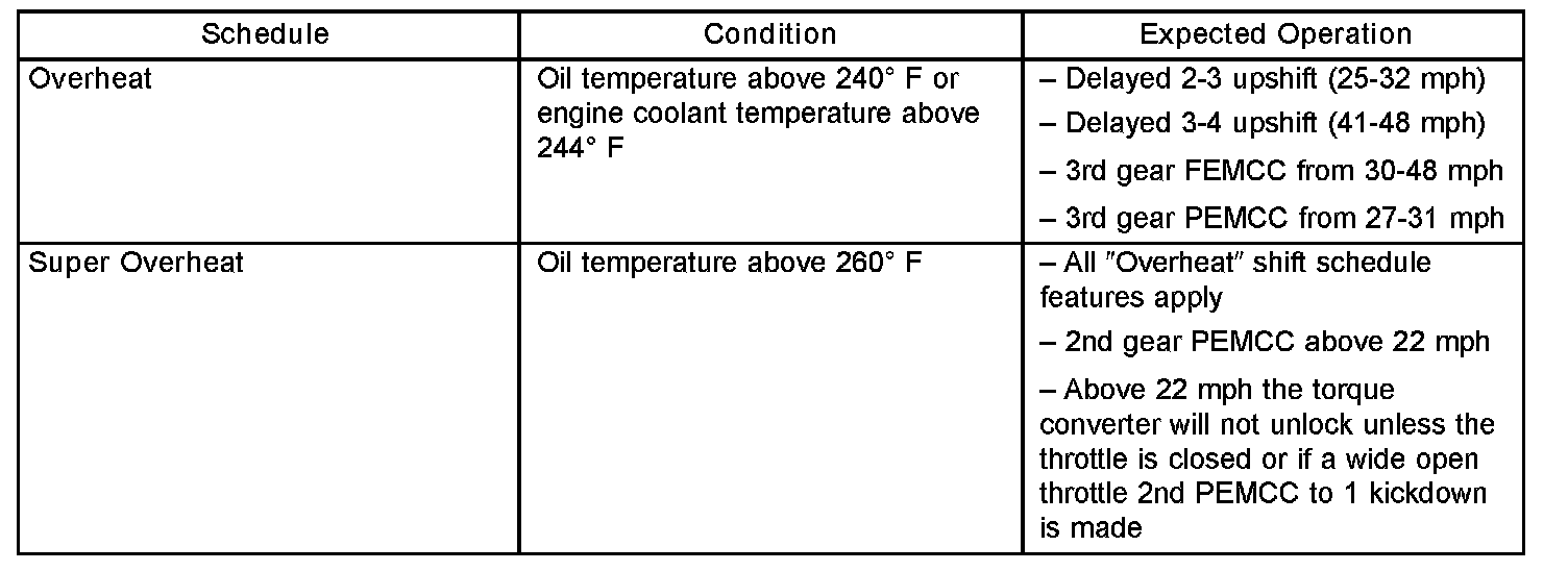 As driving conditions change, the PCM appropriately adjusts the shift schedule. Refer to the following chart to determine the appropriate operation expected, depending on driving conditions.