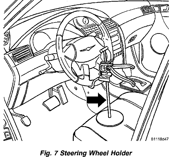3. Install steering wheel holder locking steering wheel in STRAIGHT-AHEAD position (Fig. 7).
