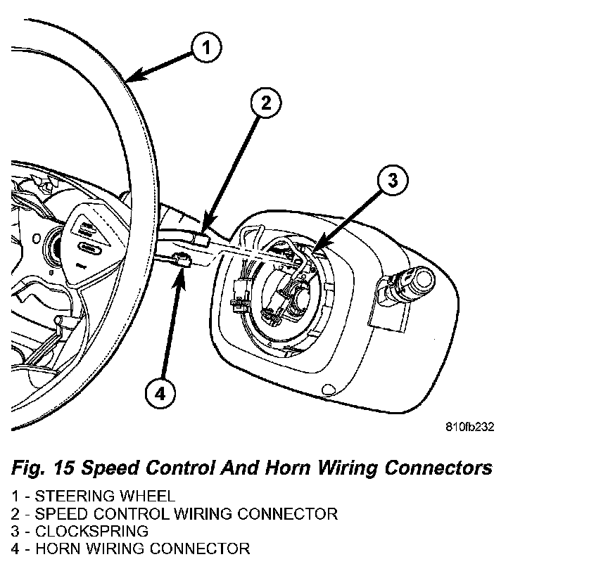 5. Disconnect speed control wiring connector at clockspring (center terminal) (Fig. 15).