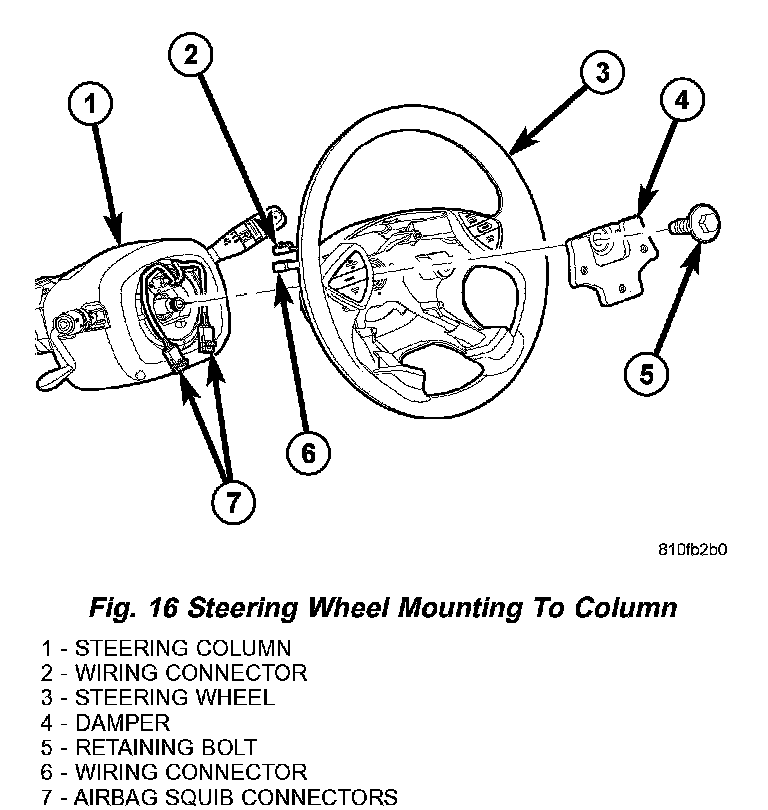5. Install steering wheel retaining bolt (Fig. 16). Tighten bolt to 61 Nm (45 ft. lbs.) torque.