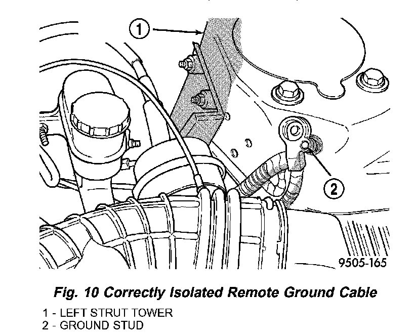 1. Remove remote ground cable from ground stud on left shock tower. Isolate ground cable from vehicle by placing isolator on stud as shown (Fig. 10).