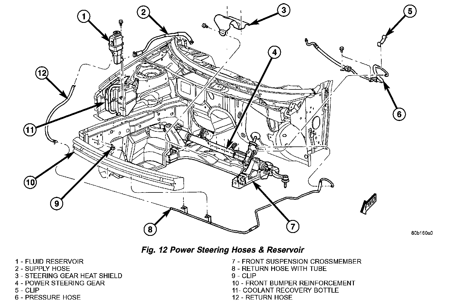 2. Install power steering fluid supply hose onto power steering fluid reservoir fitting (Fig. 12). Install clamp. Be sure hose clamp is installed on hose past upset bead on power steering reservoir fitting.