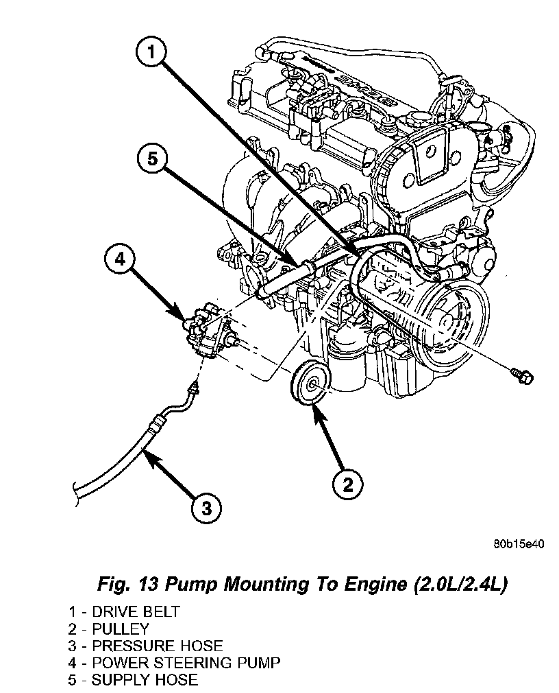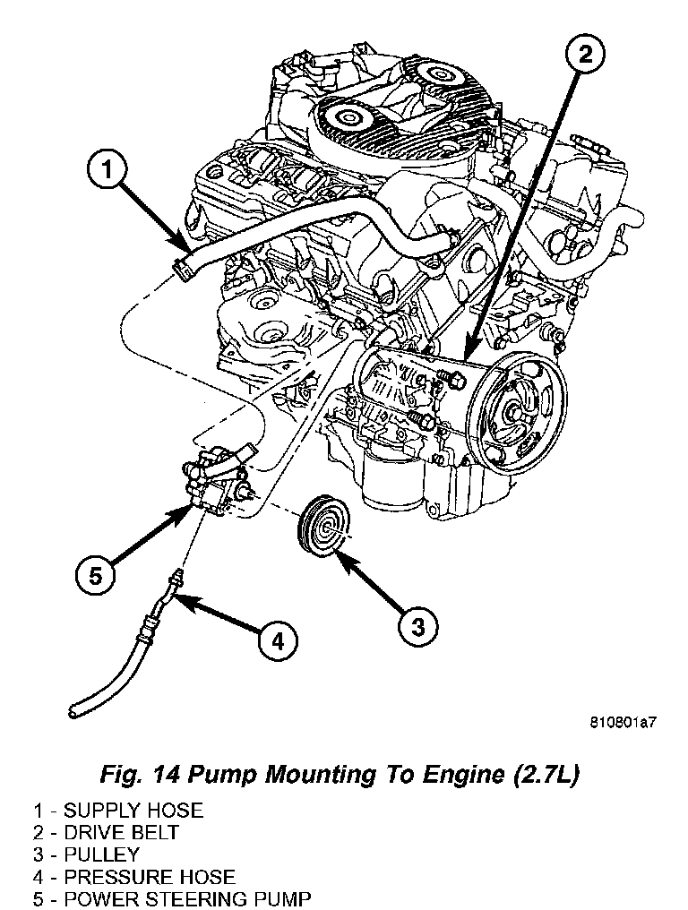 1. Install supply hose down past engine and onto power steering pump supply fitting (Fig. 13) (Fig. 14). Install clamp. Be sure hose clamp is installed on hose past upset bead on fitting.