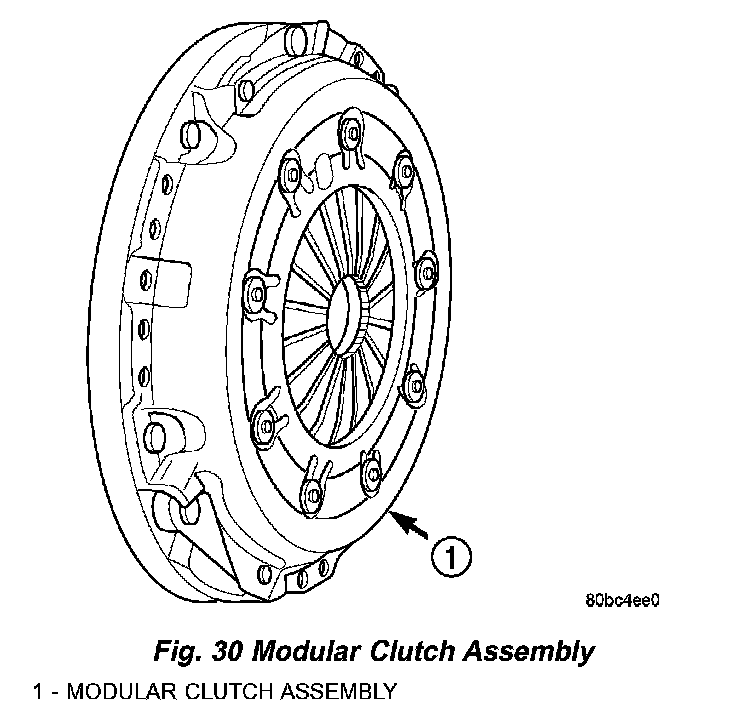 Manual transaxle equipped vehicles utilize a modular clutch assembly (Fig. 30). The transaxle must be removed to gain access to and replace the modular clutch, drive plate, and/or clutch release bearing and lever.