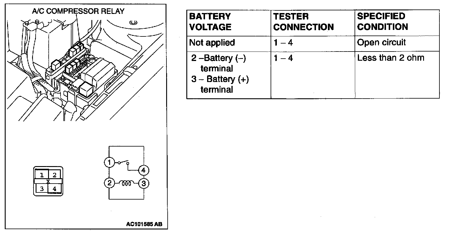 Connect the battery (+) terminal to the compressor magnetic clutch connector terminal 1; <2.4L engine>/terminal 4; <3.0L engine>, and ground the battery (-) terminal to the body of the compressor.