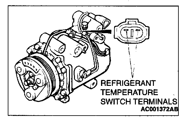 When the A/C is off, check that there is Less than 2 ohm between the refrigerant-temperature switch terminals.