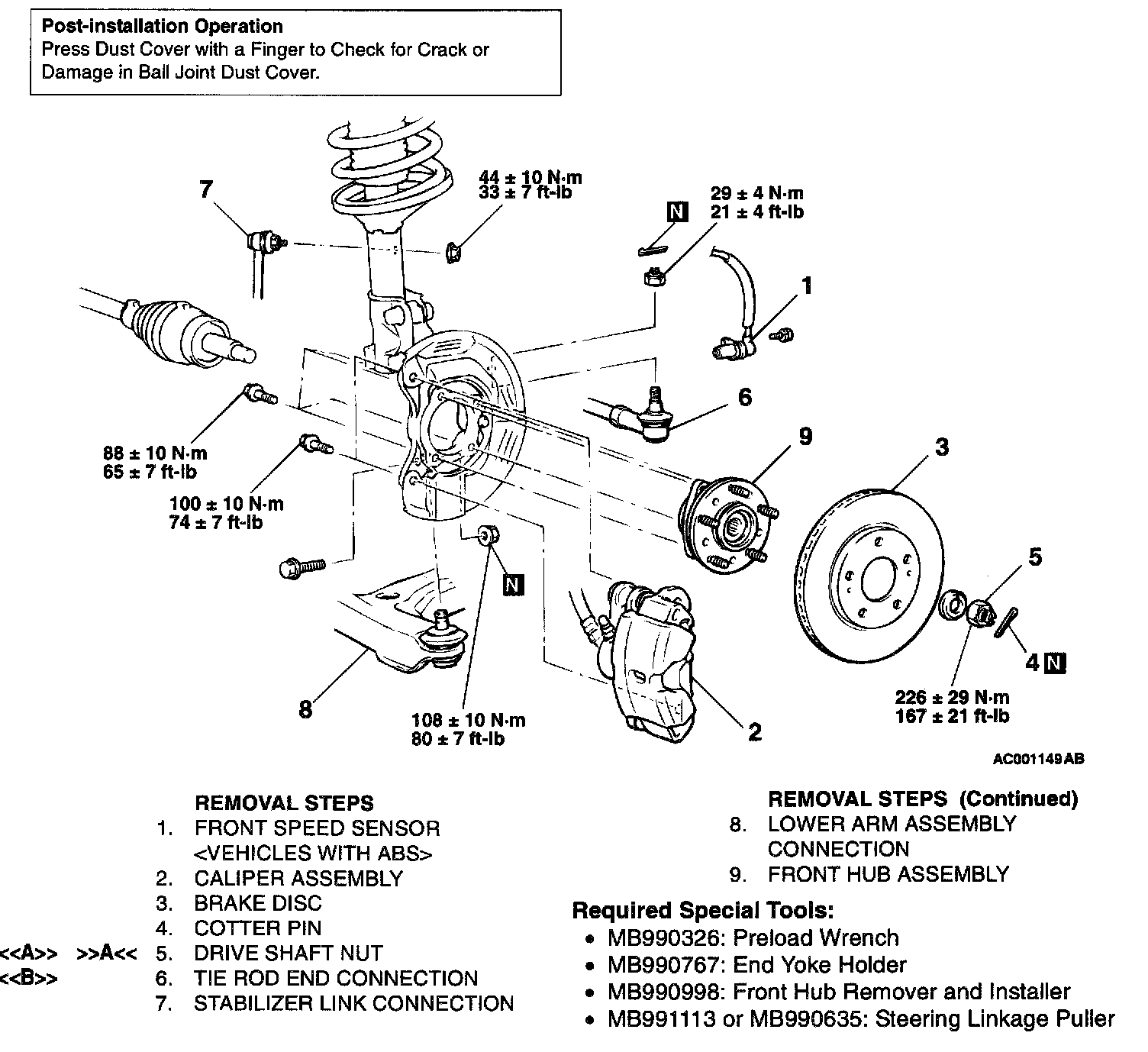 The front hub assembly should not be dissembled. When removing the front hub assembly, the wheel bearing inner race may be left at the spindle side. In this case, always replace the front hub assembly, otherwise the hub will damage the oil seal, causing oil leaks or excessive play.