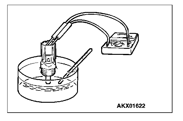 2. With the temperature sensing portion of engine coolant temperature sensor immersed in hot water, check the resistance.