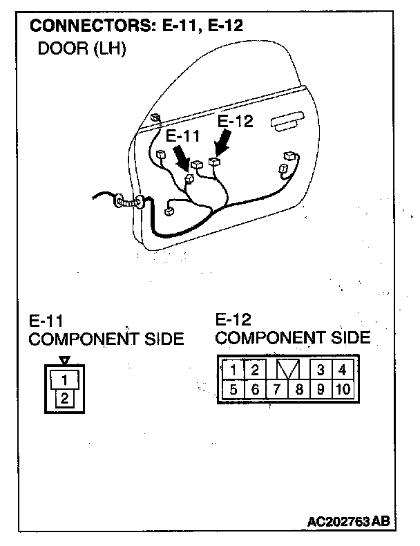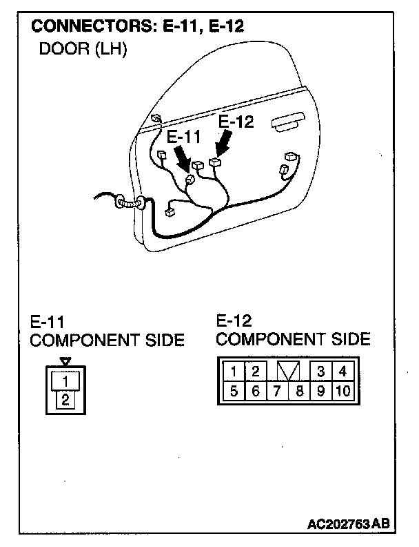 STEP 2. Check power Window main switch connector E-12 and front power window motor (LH)connector E-11 for loose, corroded or damaged terminals, or terminals pushed back in the connector.