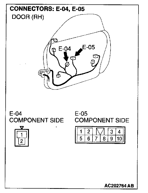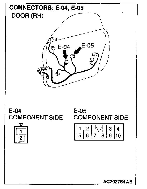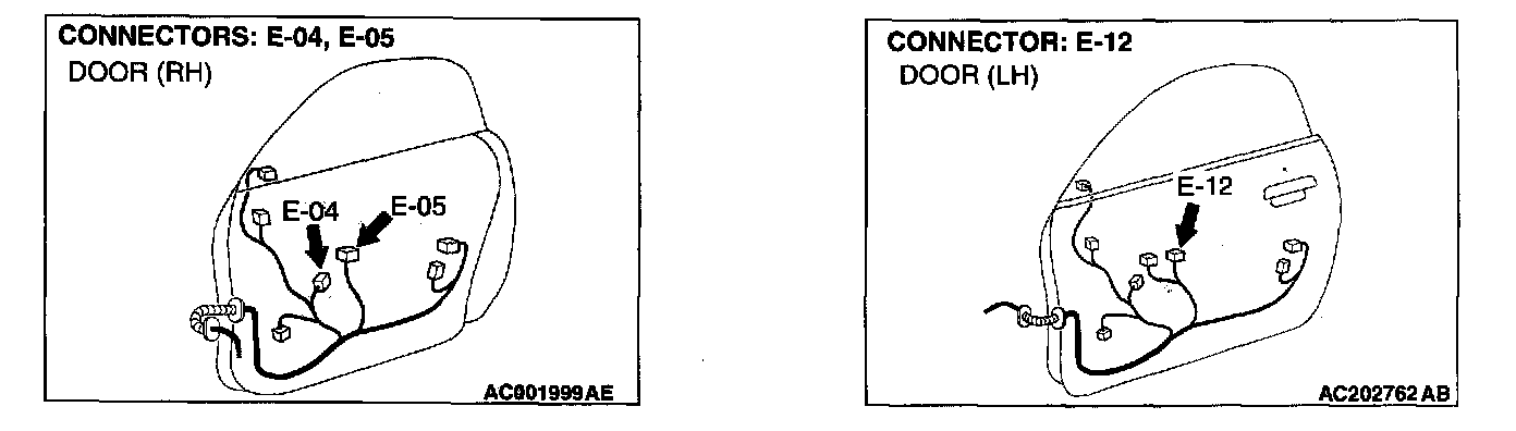 STEP 14. Check power window sub-switch connector E-05 and power window motor (RH) connector E-04 for loose, corroded or damaged terminals, or terminals pushed back in the connector.