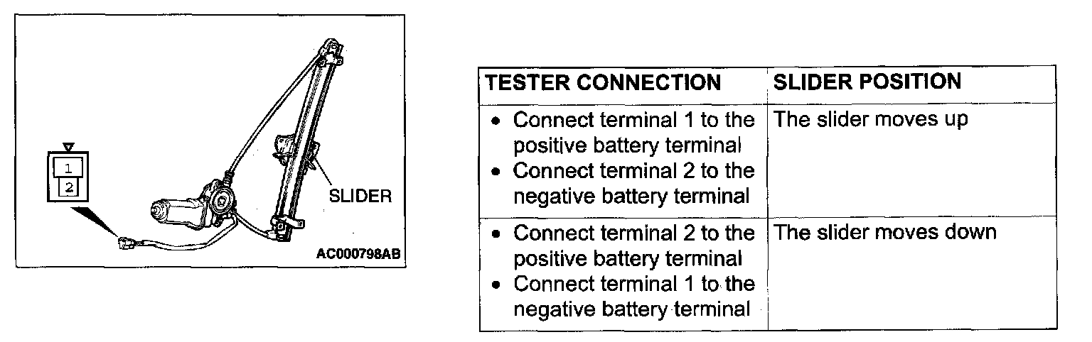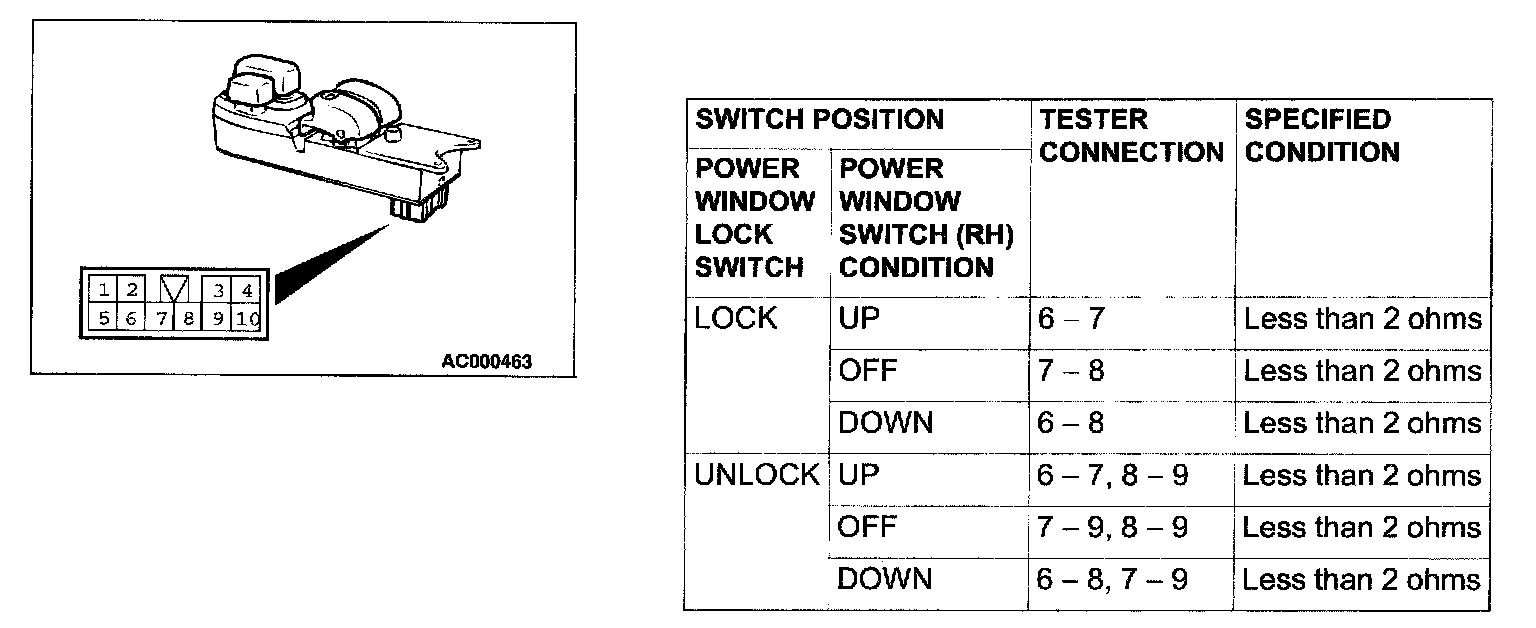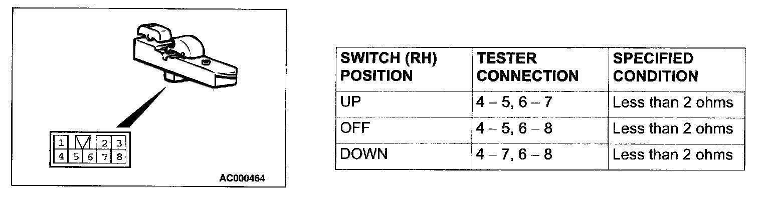 2. Follow the table below to check the power window motor (RH) for correct operation.