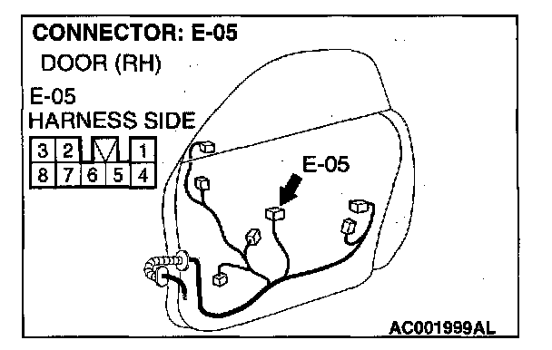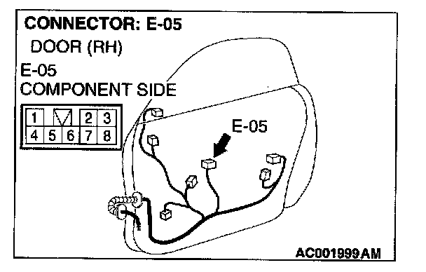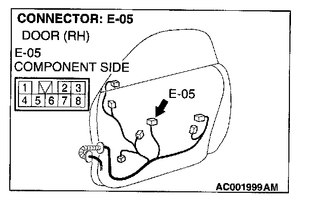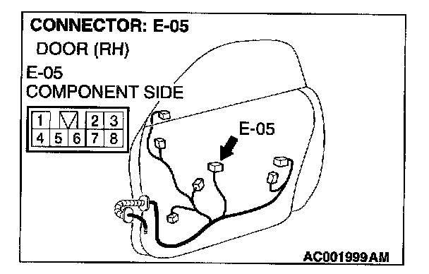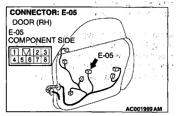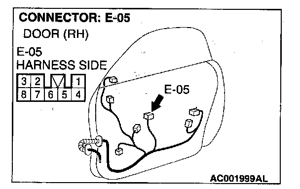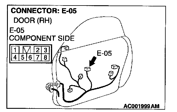 STEP 15. Check the wiring harness between power window sub-switch connector E-05 (terminals 5 and 8) and power window motor (RH) connector E-04 (terminals 2 and 1).