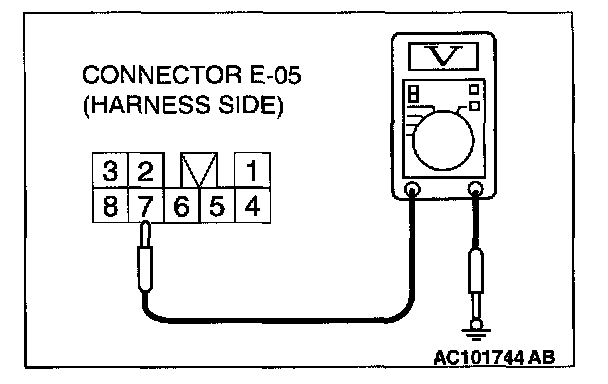 1. Disconnect power window sub-switch connector E-05 and measure the voltage available at the harness side of the connector.