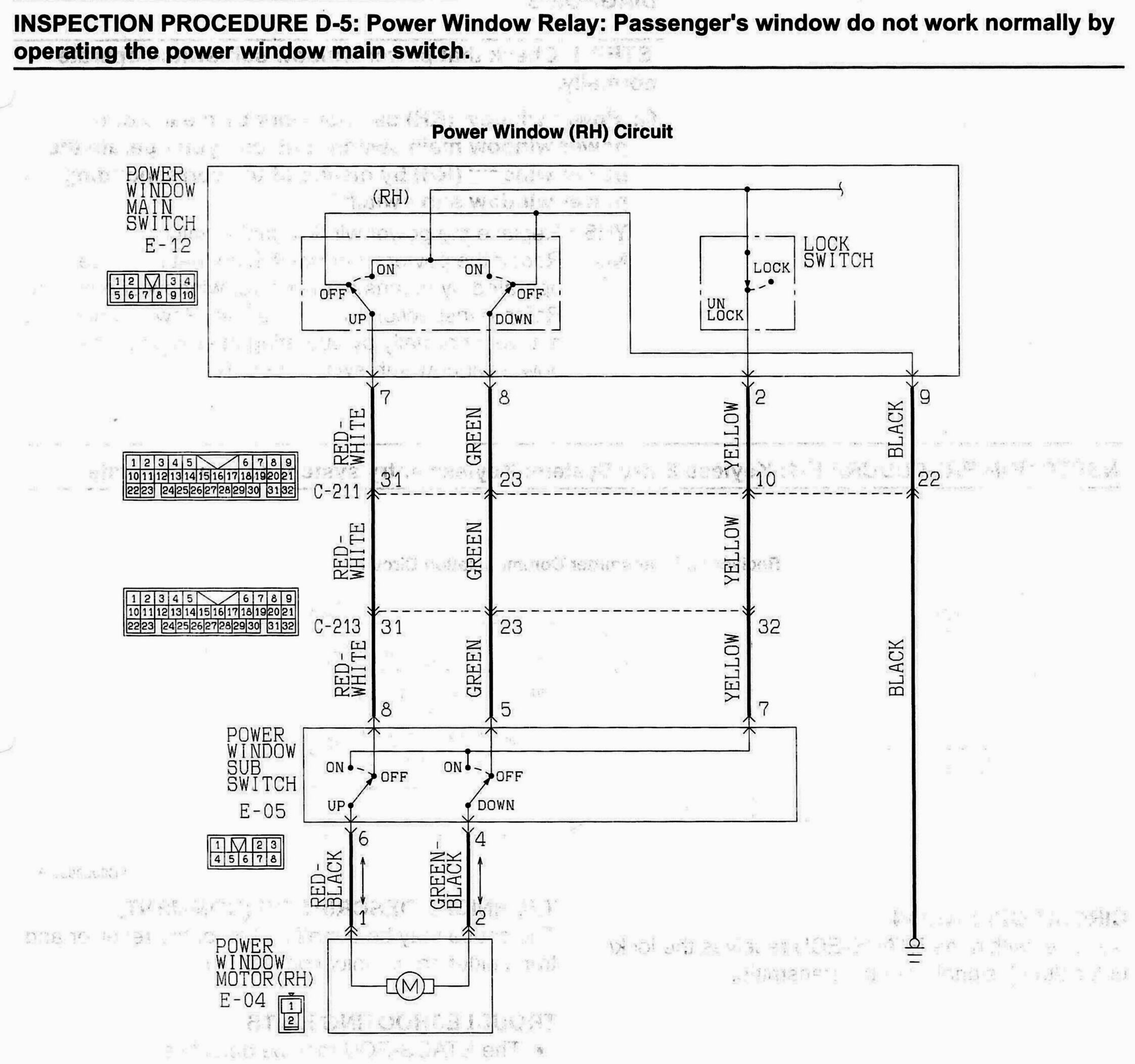 INSPECTION PROCEDURE D-5: Power Window Relay: Passenger's window do not work normally by operating the power window main switch.