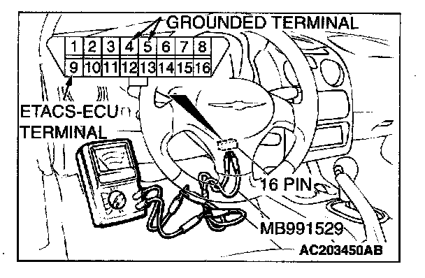 1. Use special tool MB991529 to connect a voltmeter between ground terminal 4 or 5 and ETACS-ECU terminal 9 of the data link connector.
