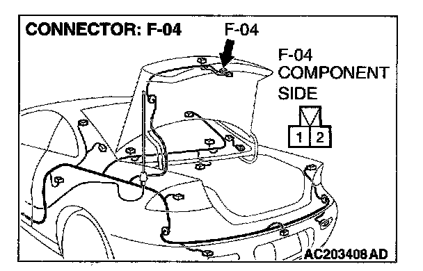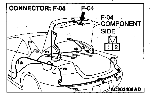 1. Disconnect trunk lid opener actuator assembly connector F-04 and measure the resistance available at the wiring harness side of the connector.