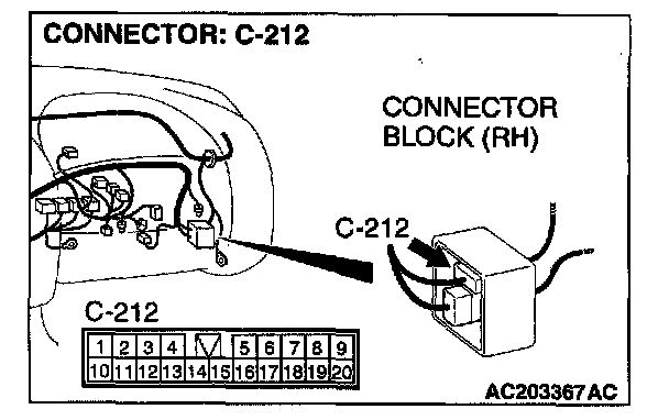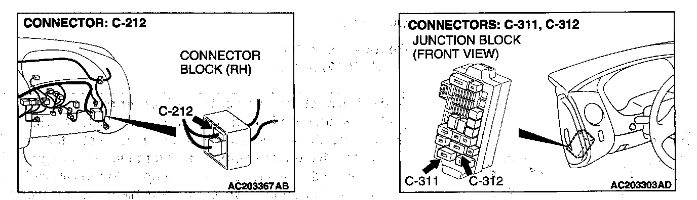 NOTE: Also check intermediate connector C-212, junction block connectors C-311 and C-312 for loose, corroded, or damaged terminals, or terminals pushed back in the connector. If intermediate connector C-212, junction block connector C-311 or C-312 is damaged, repair or replace the damaged components) as described in Harness Connector Inspection.