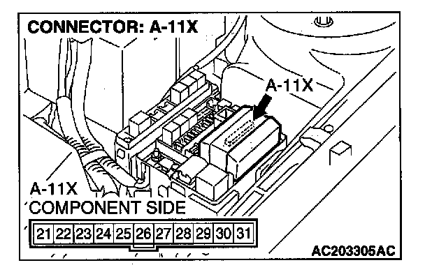 STEP 5. Check windshield wiper motor connector A-03 and front-ECU connector A-11X for loose, corroded or damaged terminals, or terminals