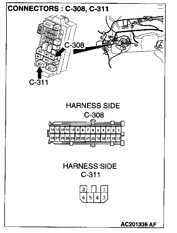 NOTE: Also check junction block connectors C-308 and C-311 for loose, corroded, or damaged terminals, or terminals pushed back in the connector. If junction block connectors C-308 or C-311 are damaged, repair or replace the damaged components) as described in Harness Connector Inspection.