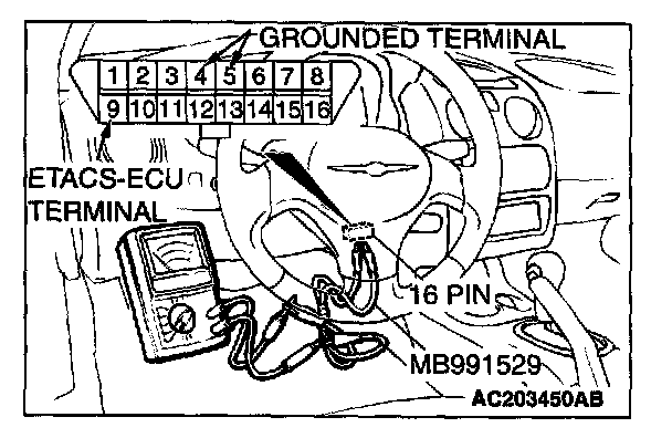 1. Use special tool MB991529 to connect a voltmeter between ground terminal 4 or 5 and ETACS-ECU terminal 9 of the data link connector.