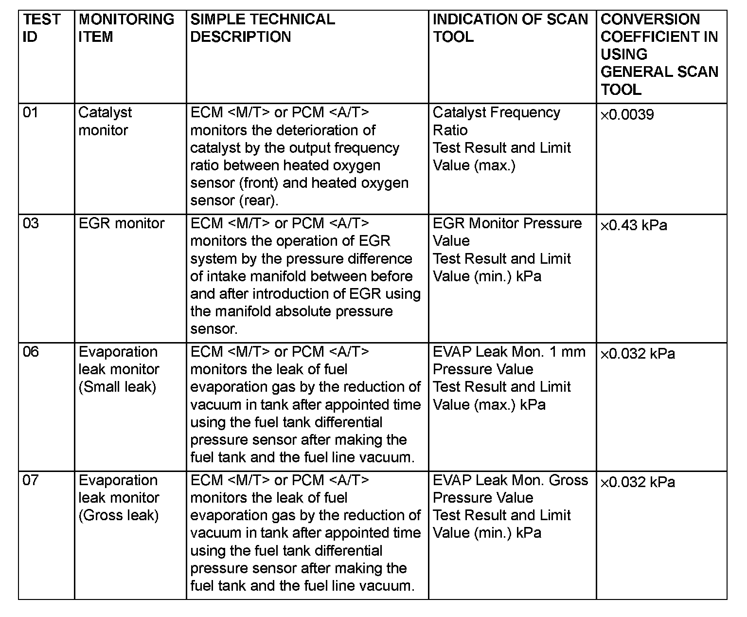 By selecting MODE 6 using scan tool, Test Result and Limit Value (minimum) *1 or (maximum) *2 about the main items of emission control system which ECM
