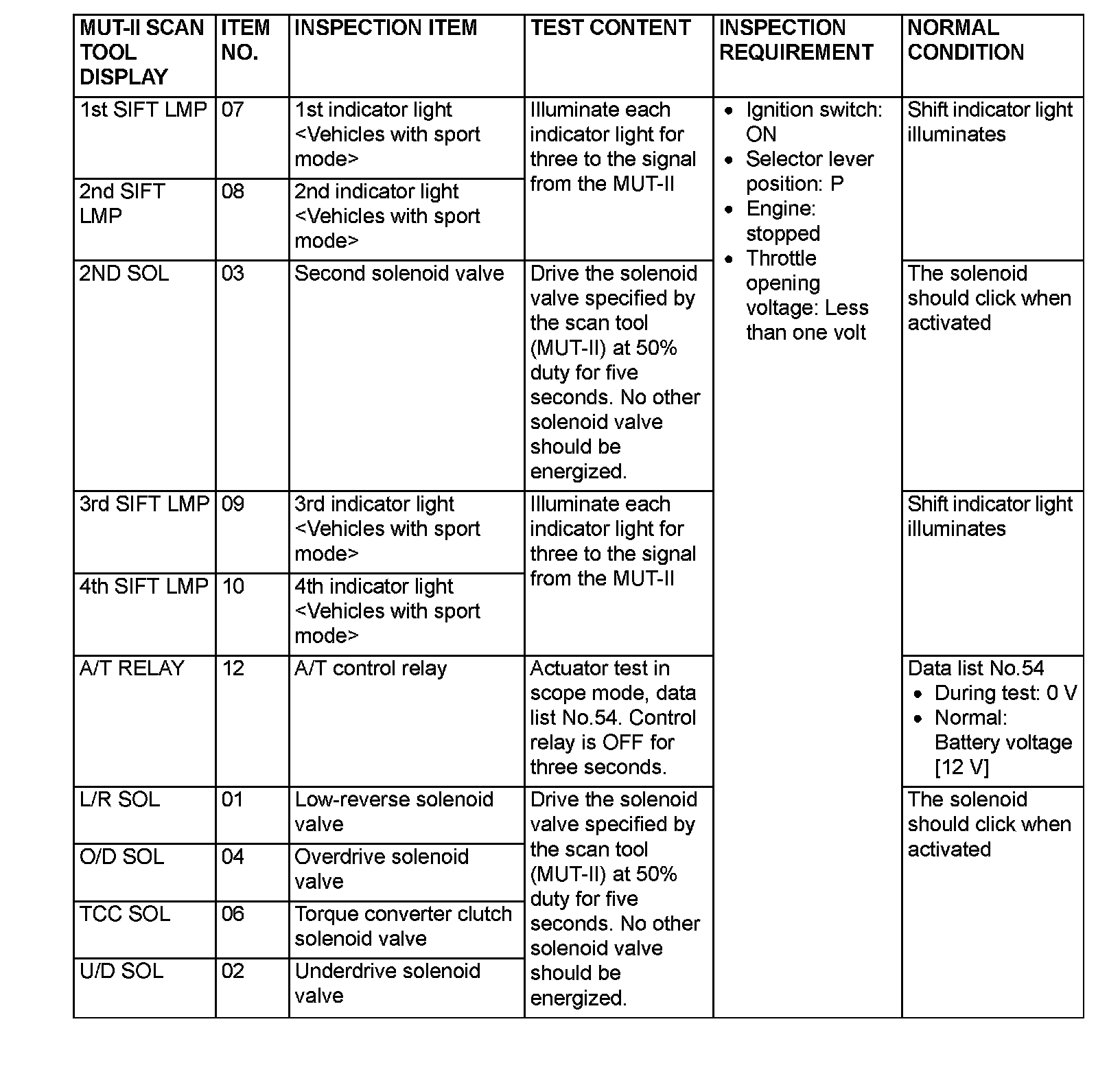 ACTUATOR TEST REFERENCE TABLE