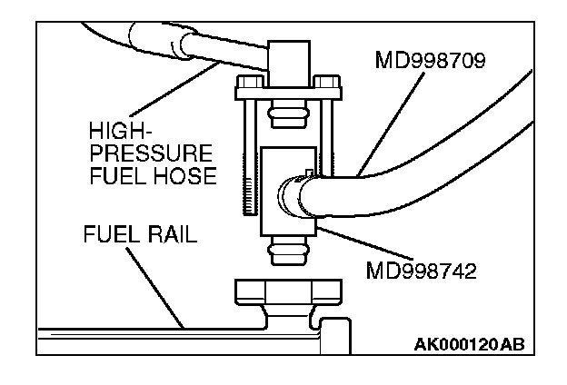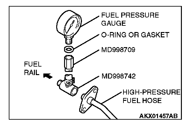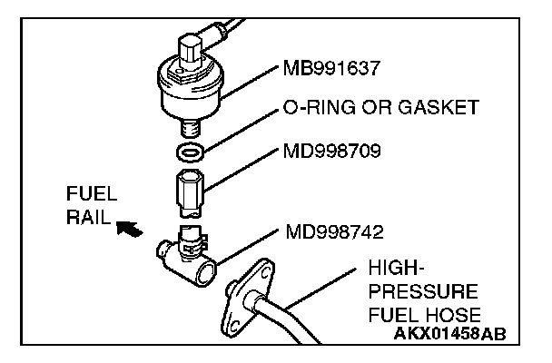 2. Place a suitable O-ring or gasket on assembled special tools MD998709 and MD998742 and install the fuel pressure gauge.
