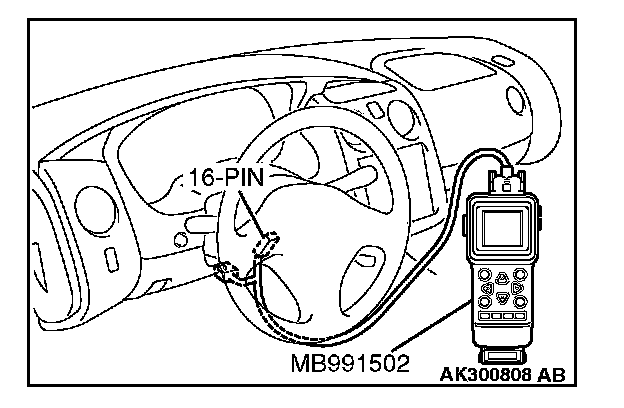 CAUTION: To prevent damage to scan tool MB991502, always turn the ignition switch to the "LOCK" (OFF) position before connecting or disconnecting scan tool MB991502.
