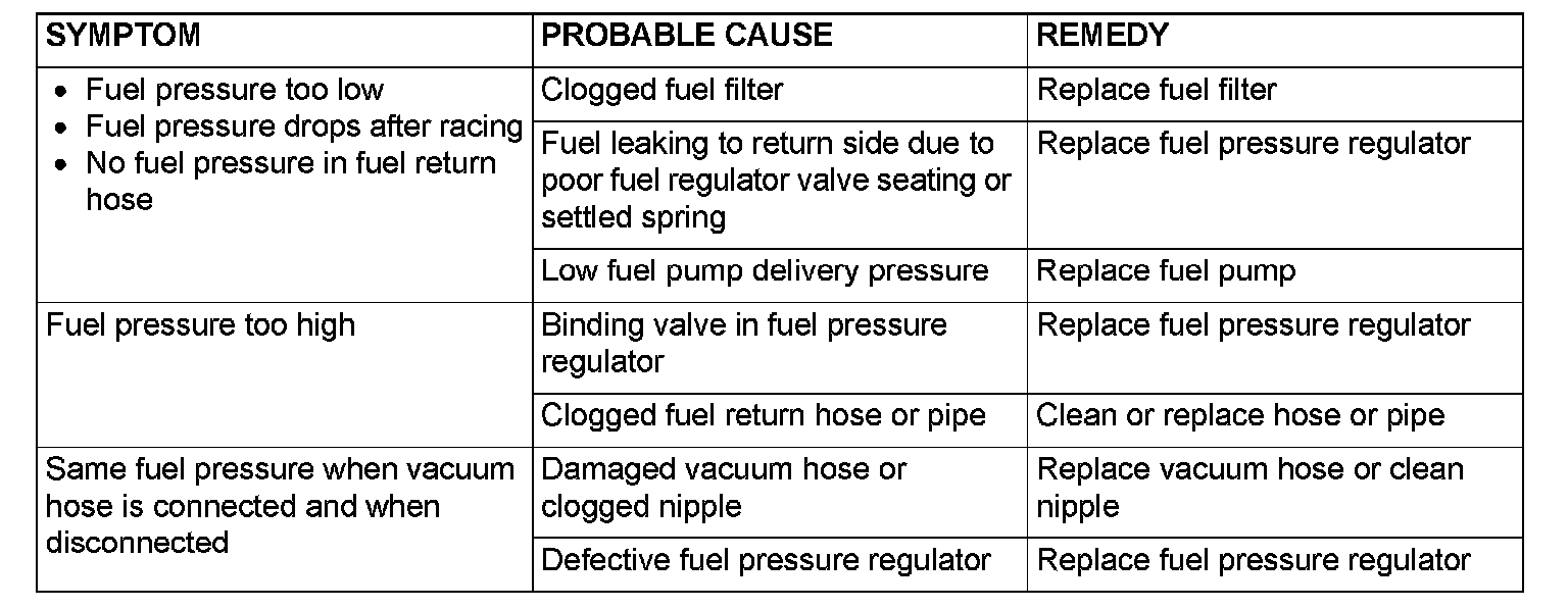 12. If any of fuel pressure measured in steps 10 to 13 is out of specification, troubleshoot and repair according to the table below.