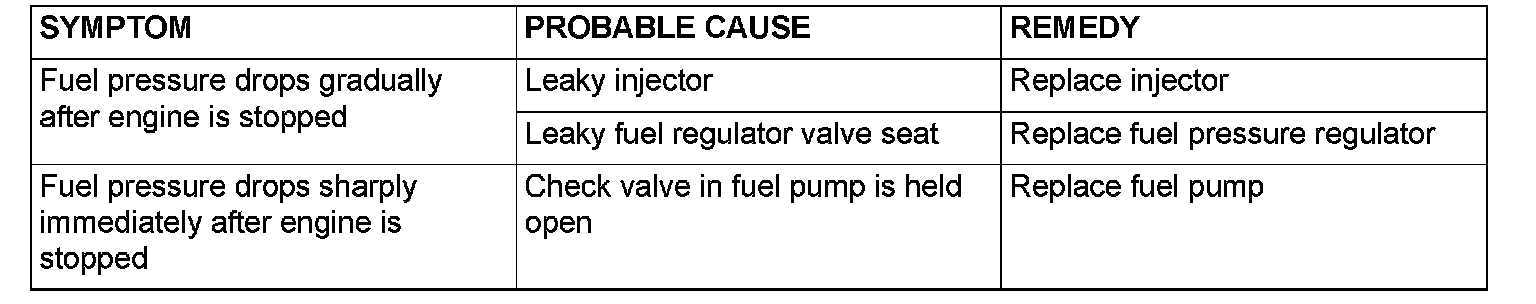 13. Stop the engine and observe fuel pressure gauge reading. It is normal if the reading does not drop within two minutes. If it does, observe the rate of drop and troubleshoot and repair according to the table below. Start, then stop the engine.