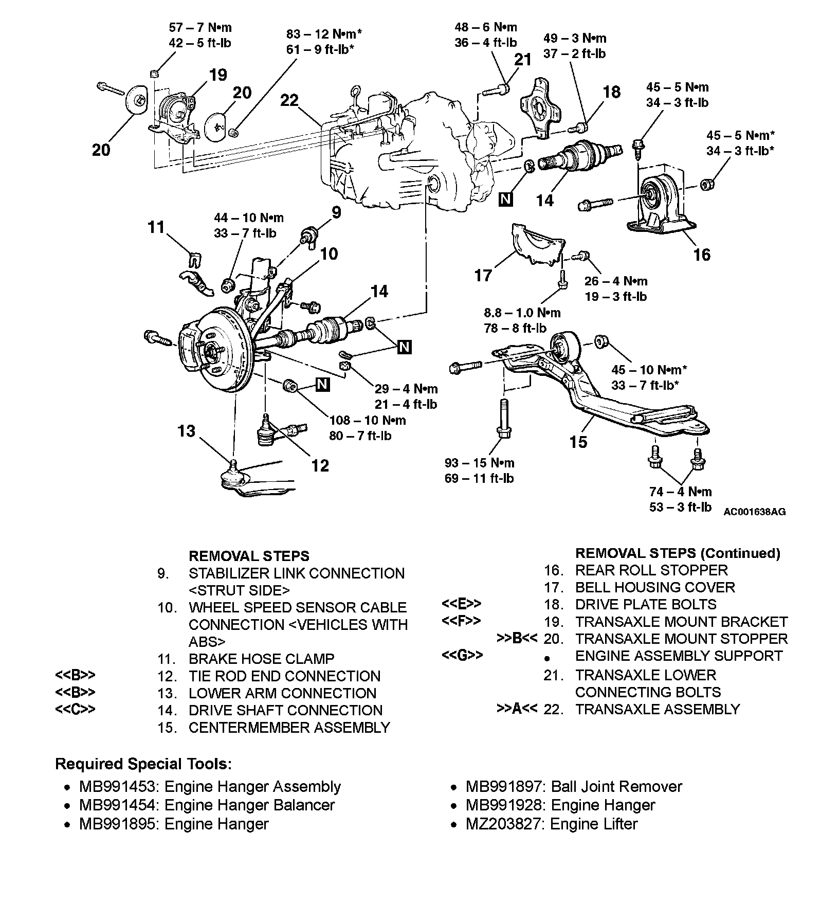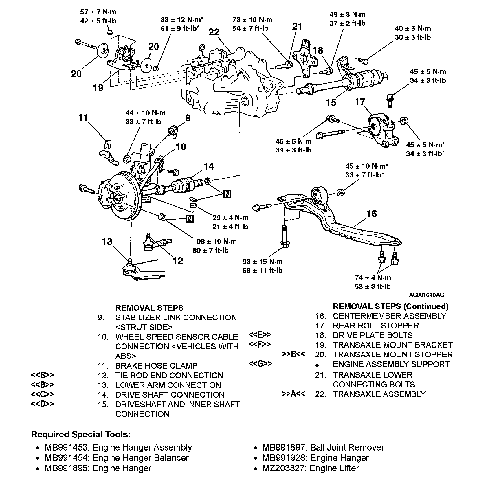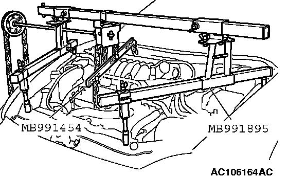 3. Set special tools MB991454 to hold the engine/transaxle assembly.